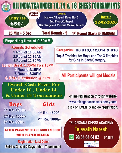 26th All India TCA Under 10, Under 14 & Under 18 Chess Tournament-08/02/2026