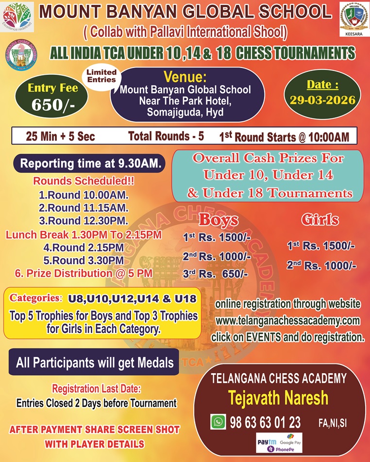 7th Mount Banyan Gobal School All India TCA Under 10, Under 14 & Under 18 Chess Tournament-29/03/2026